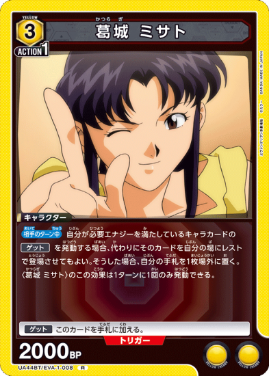 相手のターン中自分が必要エナジーを満たしているキャラカードのゲットを発動する場合、代わりにそのカードを自分の場にレストで登場させてもよい。そうした場合、自分の手札を1枚場外に置く。〈葛??城 ミサト〉のこの効果は1ターンに1回のみ発動できる。