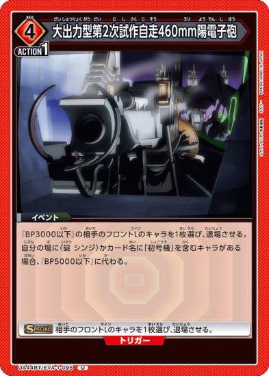 『BP3000以下』の相手のフロントLのキャラを1枚選び、退場させる。自分の場に〈碇 シンジ〉かカード名に「初号機」を含むキャラがある場合、『BP5000以下』に代わる。