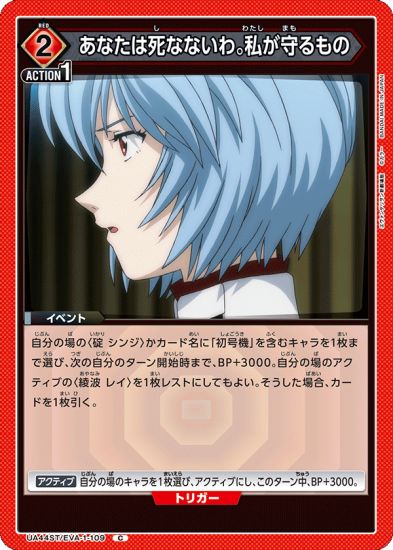 自分の場の〈碇 シンジ〉かカード名に「初号機」を含むキャラを1枚まで選び、次の自分のターン開始時まで、BP+3000。自分の場のアクティブの〈綾波 レイ〉を1枚レストにしてもよい。そうした場合、カードを1枚引く。