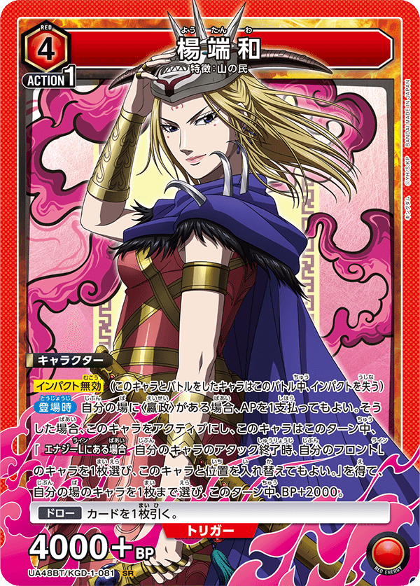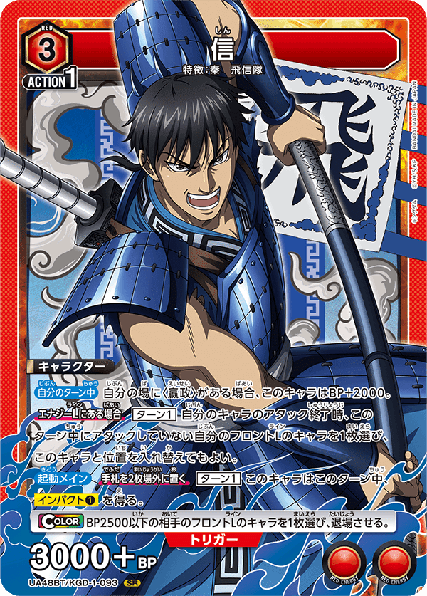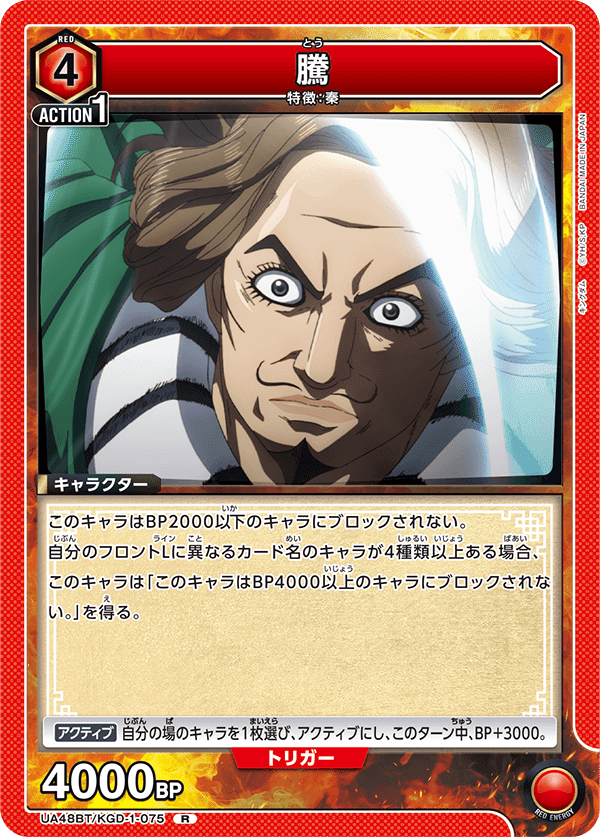 嬴政デッキの4000アタッカーの1人。2種のすり抜け効果を持っており、アタック順によってはアクティブトリガーを貫通したり、終盤の詰め要員にもなったりと優秀なカードです。
